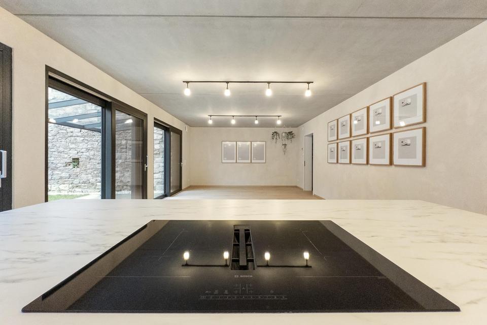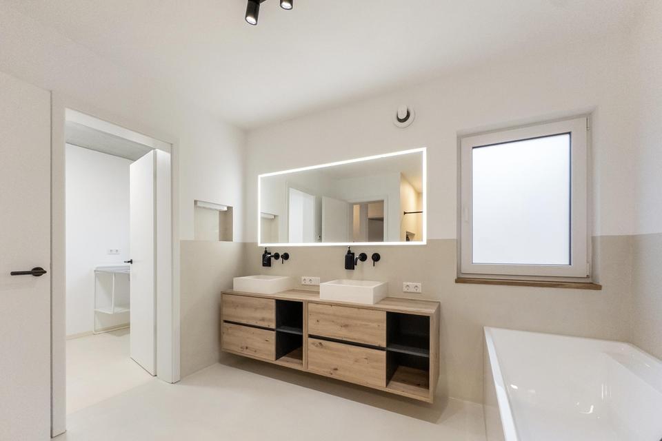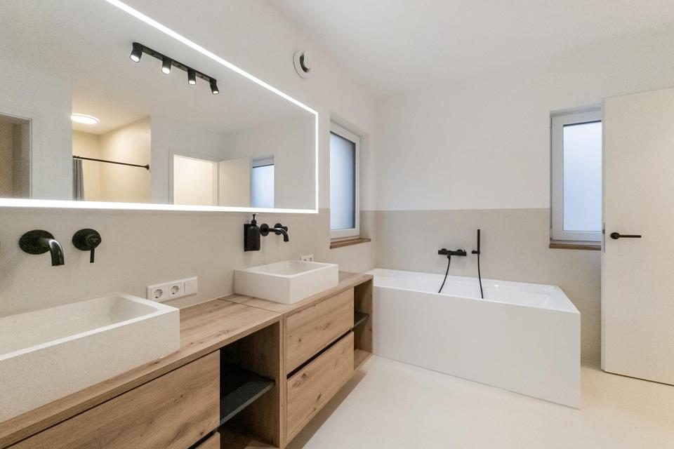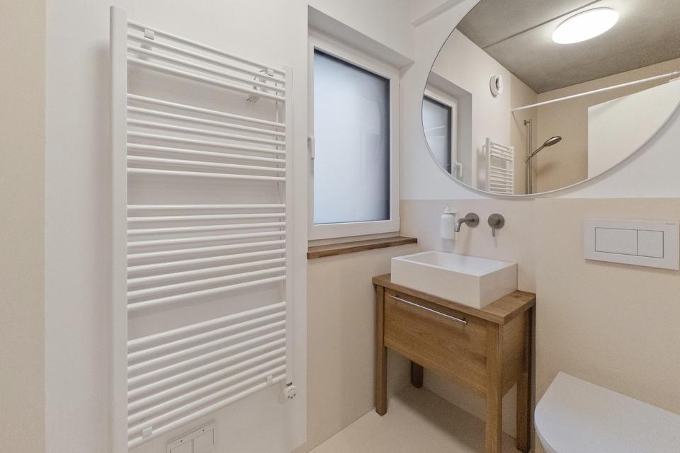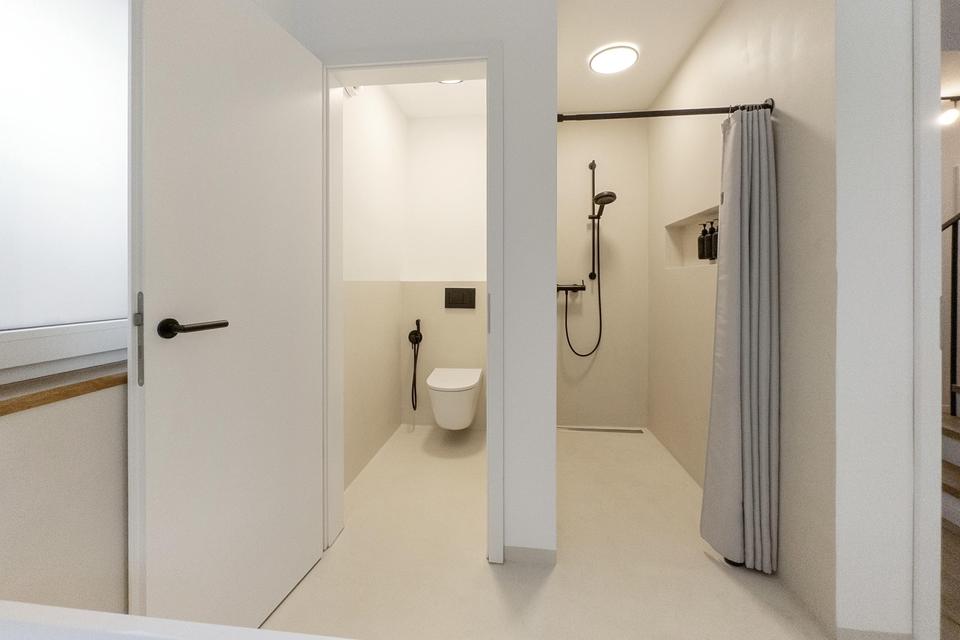 • Fugenlose Mikrozementflächen in den Bädern für hygienische und pflegeleichte Boden- und Wandflächen