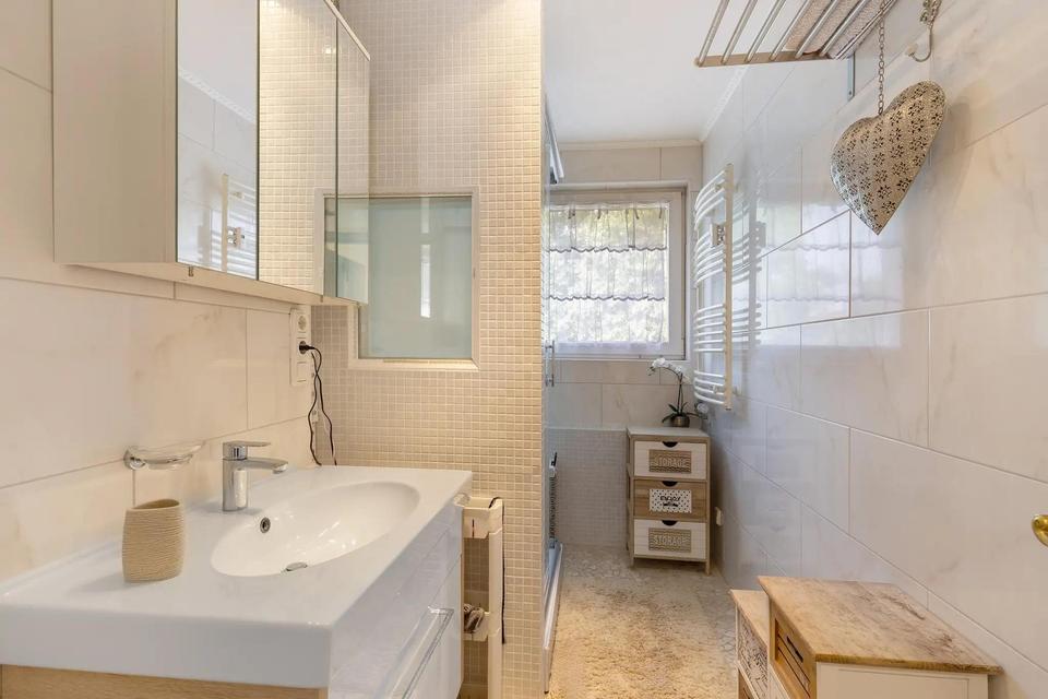 Das Tageslicht-Bad hat eine Toilette und eine moderne Dusche. Das Bad wurde vor 8 Jahren eingebaut, die Dusche letztes Jahr.