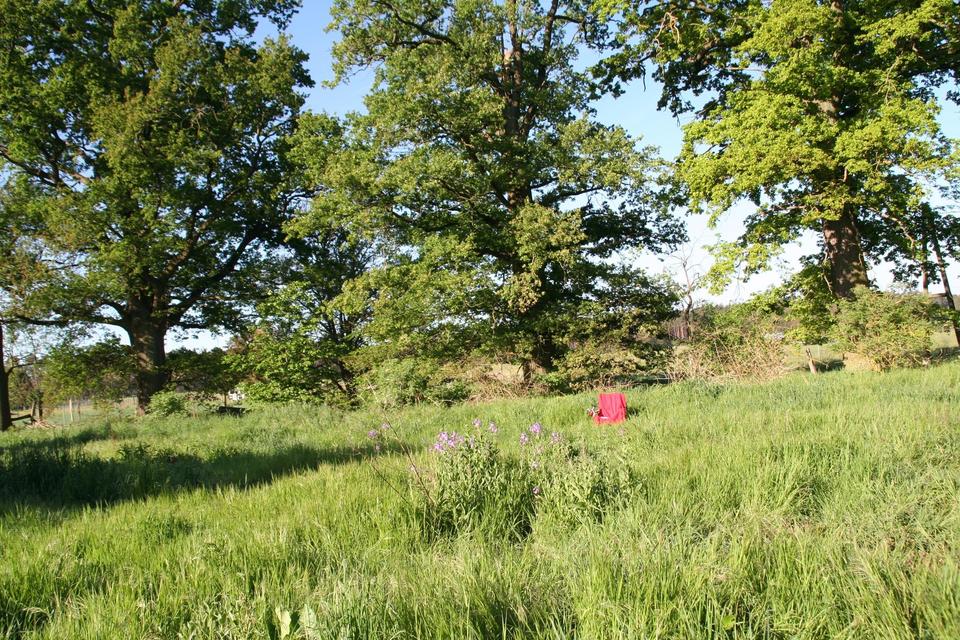 Hinter der Scheune erstreckt sich eine ca. 3.000 m2 große Freifläche, die mit Obst- und Nussbäumen sowie drei beeindruckenden, Jahrhunderte alten Eichen an der westlichen Grundstücksgrenze zum Verweilen einlädt. Dieser Bereich bietet zahlreiche Möglichkeiten: von naturnaher Freizeitgestaltung bis hin zur Nutzung als Abreiteplatz oder als Gartenparadies.