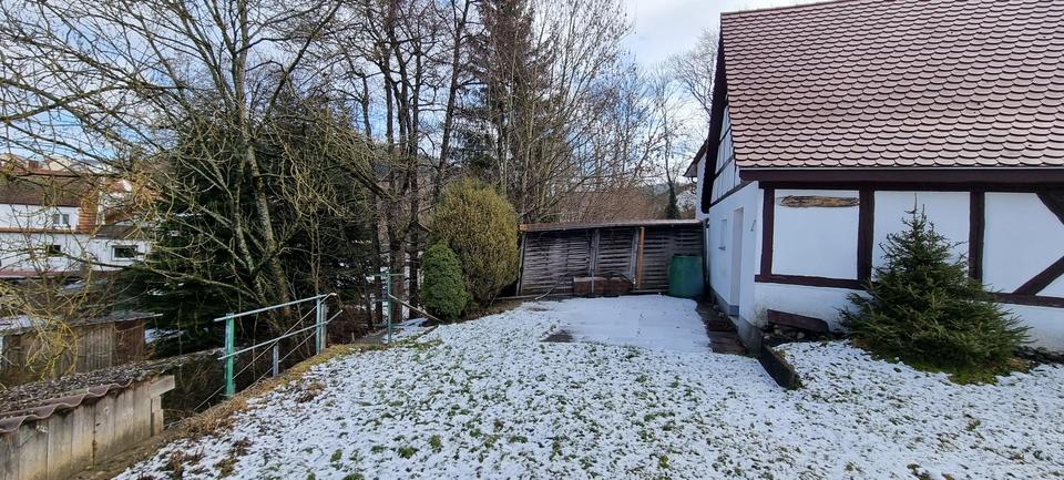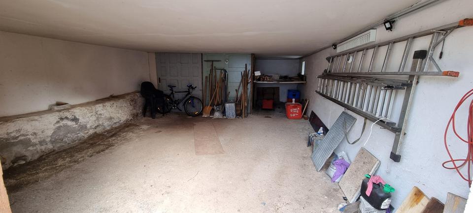 Erschlossenes Baugrundstück mit großer Garage, viel Stauraum und einer kleinen Werkstatt.