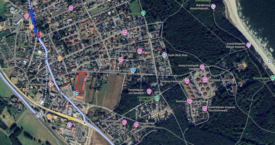 Dieses unbebaute und voll erschlossene Grundstück befindet sich in der ruhigen Siemensstraße am südlichen Ortsrand von Koserow auf der beliebten Insel Usedom. Nur rund 800 m Luftlinie vom Ostseestrand entfernt, bietet es beste Voraussetzungen für Ihr Bauvorhaben – ob Einfamilienhaus, Ferienimmobilie oder ggf. ein Mehrfamilienhaus (nach Abstimmung mit den zuständigen Behörden).