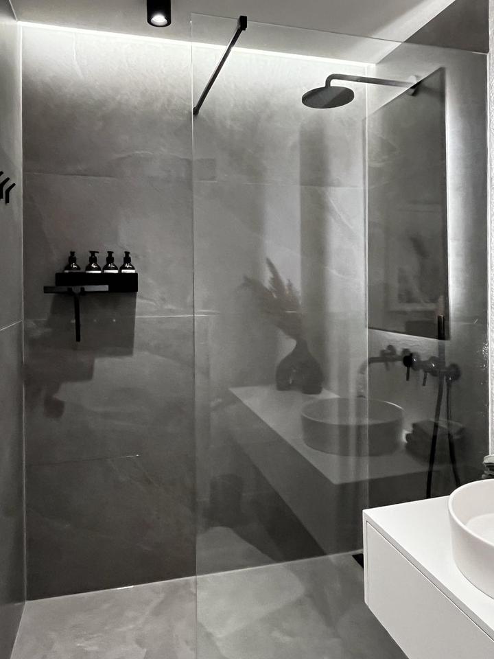 – modernes Badezimmer mit großformatigen Feinsteinzeugfliesen,