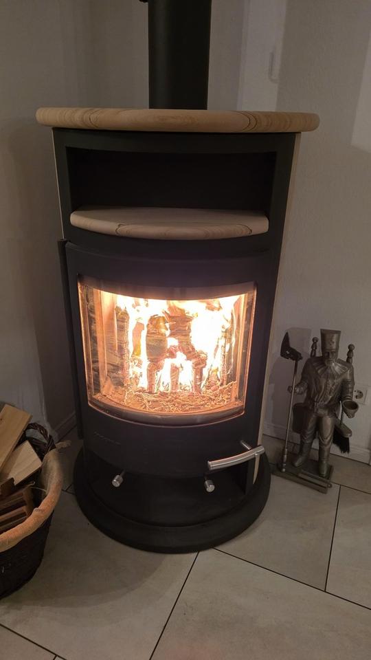 lichtdurchfluteter Wohn- und Essbereich mit Kaminofen und offener Küche (Einbauküche Nobilia),