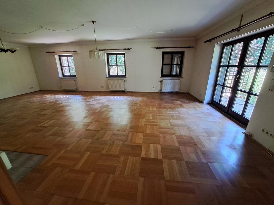 Dieses großzügige und gut geschnittene, mit 7 Zimmern ausgestattete und komplett unterkellerte freistehende Einfamilienhaus steht in einer ruhigen Anliegerstraße unweit des Zentrums der Gemeinde Grünwald (ca. 11.000 Einwohner), im Landkreis München in Bayern. Das 1990 erbaute Haus hat ein Erdgeschoss und ein Obergeschoss mit insgesamt 268m² Wohnfläche. Im Dachgeschoss gibt es eine Ausbaureserve. Zum Haus gehört eine angebaute Garage, ein Stellplatz, ein riesiger Garten, eine großzügige nach Südwesten ausgerichtete Terrasse und ein entlang der Südost- und Südwestfassade verlaufender überdachter Balkon mit Blick ins Grüne.