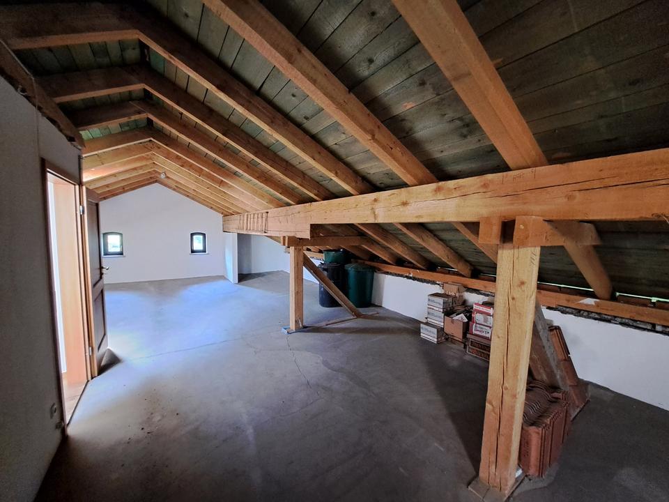 Weiter geht es über die Treppe in das Dachgeschoss. Die Geschossdecke (Beton) und das Gebälk des Dachbodens sind sichtbar. Je zum Giebel sind 2 kleine gewölbte Fenster eingebaut. Der Zugang auf das großflächige Dach wird durch 2 Dachfenster gewährleistet.
