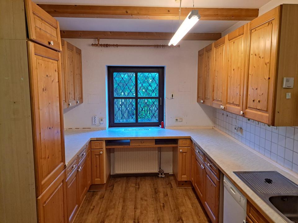 Über den Eingangsbereich im EG gelangt man in eine Garderobe. Von der Garderobe gehen eine Abstellkammer und ein gefliestes Gäste-WC ab. An der Treppe rechts vorbei geht es in die Küche mit einem sich anschließenden Essbereich. Die Räume sind durch einen Wanddurchbruch verbunden und mit einem Fußbodenbelag in Holzoptik ausgestattet. Teilweise wurden hier Wände gefliest. Die Zimmertüren sind massiv in einer Holzoptik. Die Küche wurde in zwei Bereich unterteilt. Mitverkauft werden eine rustikale Einbauküche mit Oberschränken und eine separat stehende Küchenzeile mit einzelnen Küchengeräten (geschätzt 60 er bis 70 er Jahre. Die Küche hat ein Fenster zum Vorgarten. Das angrenzende Esszimmer verfügt über zwei Fenster in Richtung Gartengrundstück und ein Verbindungstür in ein weiteres, repräsentatives Esszimmer. Das separate Esszimmer mit Blick auf die Terrasse hat auch einen direkten Zugang vom Eingangsbereich aus. Weiter geht es über einen Durchbruch mit Doppelschiebetür, aus Holz, in den repräsentativsten Teil des Erdgeschosses, ein rund 50 m² großes Wohnzimmer mit Kamin.