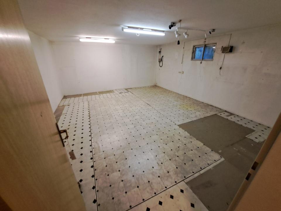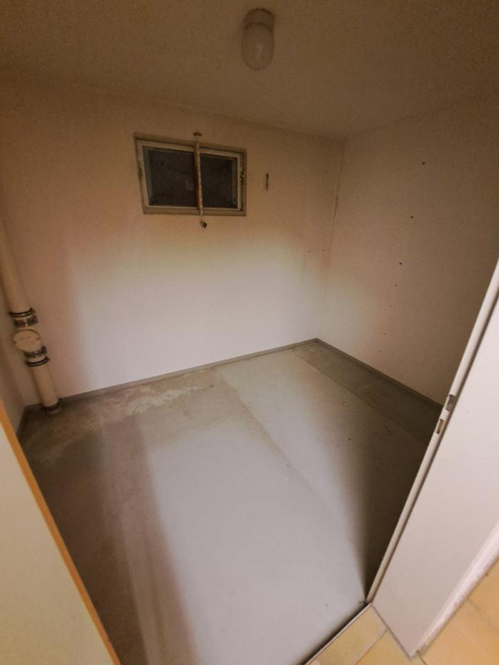 Wieder im Erdgeschoss angekommen führt eine geflieste Treppe von der Eingangshalle aus in den Keller. Hier befinden sich das Öltanklager und die Ölheizung. Darüber hinaus gibt es eine zentrale Warmwasserversorgung. Neben dem Wasch- und Vorratsraum sind noch drei weitere Räume im Untergeschoss.