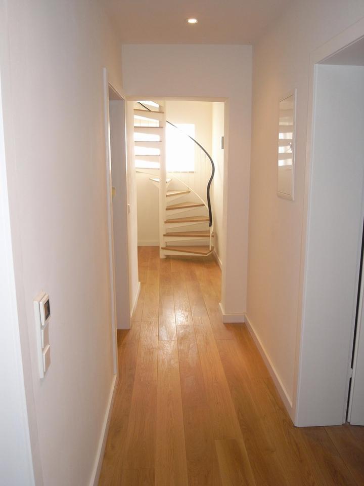 Im Obergeschoss befinden sich neben einem modernen Badezimmer mit Dusche drei gut geschnittene Schlafzimmer, von denen lediglich eines zur Straßenseite ausgerichtet ist. Ein weiteres Schlafzimmer verfügt über einen Balkon mit Blick in den Garten. Die Böden dieser Etage wurden durchgehend mit hochwertigen massiven Eichendielen im Landhausstil versehen.