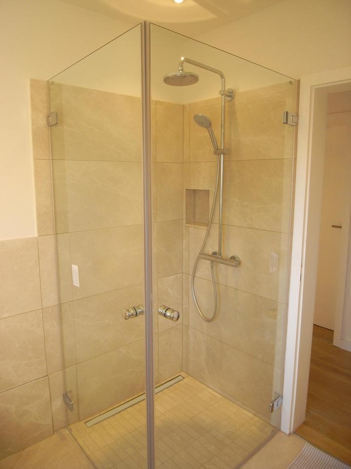 Auch die Bäder wurden vollständig neu gestaltet: Neben dem Gäste-WC wurden das Duschbad sowie ein weiteres Badezimmer im Dachgeschoss von Grund auf modernisiert. Hierbei kamen ausschließlich hochwertige Materialien zum Einsatz, darunter edle Fliesen – unter anderem aus Marmor – sowie exklusive Armaturen von Grohe und Ideal Standard und Sanitärobjekte von Villeroy & Boch. Gläserne Duschabtrennungen, Wandheizungen sowie eine elektrische Fußbodenheizung unterstreichen den gehobenen Wohnkomfort und schaffen ein besonderes Wohlfühlambiente.