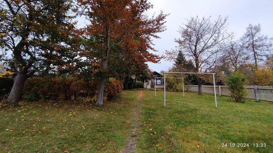 Am oberen Ende des großen Grundstückes (1300m²) befindet sich ein massives Gartenhaus mit Wasser- und Elektroanschluss. Ein Kachelofen dient zur Beheizung. Von da aus gibt es eine sehr schöne Aussicht. Ebenso von einer unterhalb gelegenen Terrasse mit Platz für Schaukel etc.
