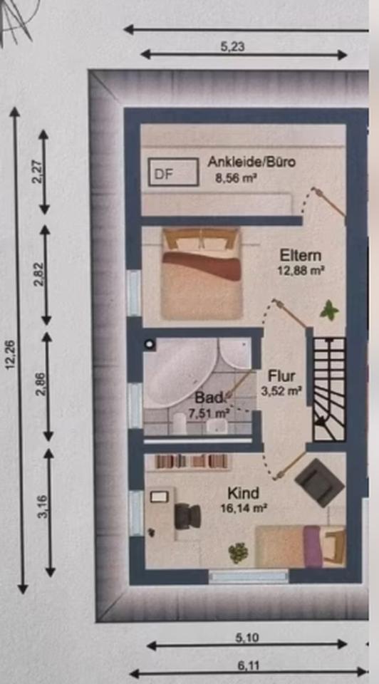 Die Wohnfläche von ca. 105 m² verteilt sich auf Erd- und Obergeschoss. Zusätzlich steht ein offenes Loft im Dachgeschoss zur Verfügung, ideal als Arbeits-, Hobby- oder Rückzugsraum. Im Obergeschoss befindet sich außerdem ein Schlafbereich mit begehbarer Ankleide.