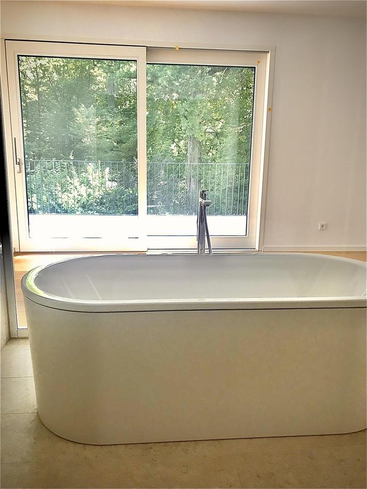 Ein Highlight der Wohnung ist das innenliegende Tageslichtbad mit freistehender Badewanne welches einen direkten Blick in den Wald erlaubt. Daher ein Bad mit außergewöhnlicher Ästhetik und exklusivem Charakter.