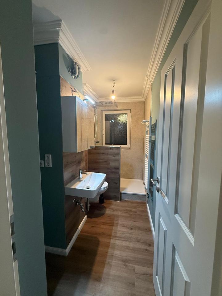 – Bad komplett neu umgebaut- Stahl Duschwanne superflach 90x140cm, Schütte Ocean Duschsysthem mit Thermostat und Glasablage (Regendusche), wandhängendes WC mit Unterputzspülkasten (Geberit) Inkl. Stromanschluß für Dusch-Wc. Toilettensitz mit soft-close, Waschtischanlage mit Einhebelmischer, Duschabtrennung 8mm ESG. Waschmaschinenanschluß. Handtuchheizkörper, Spiegelschrank.