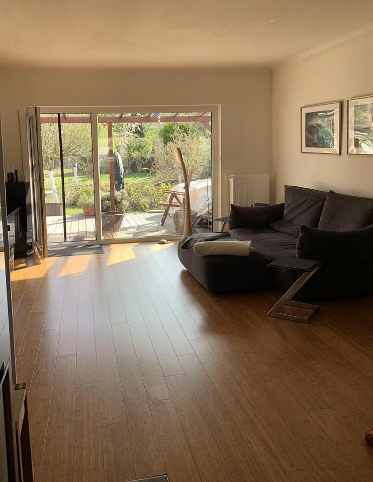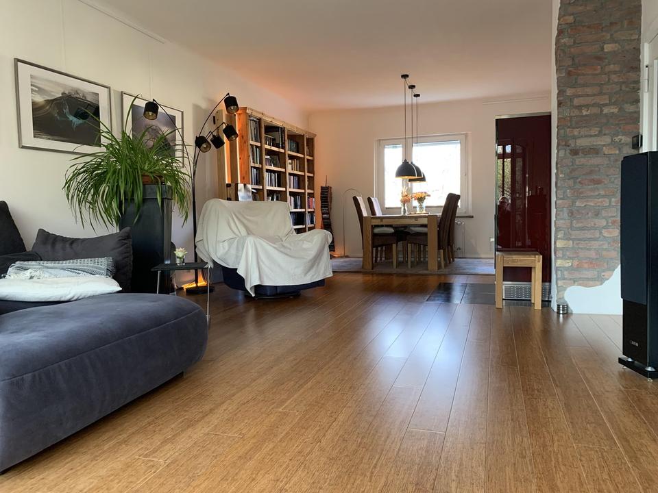 -Großer Wohn-, Essbereich mit hochwertigem Bambus Parkett und Holz Speicherofen, lichtdurchflutet durch bodentiefe Fenster zum Garten