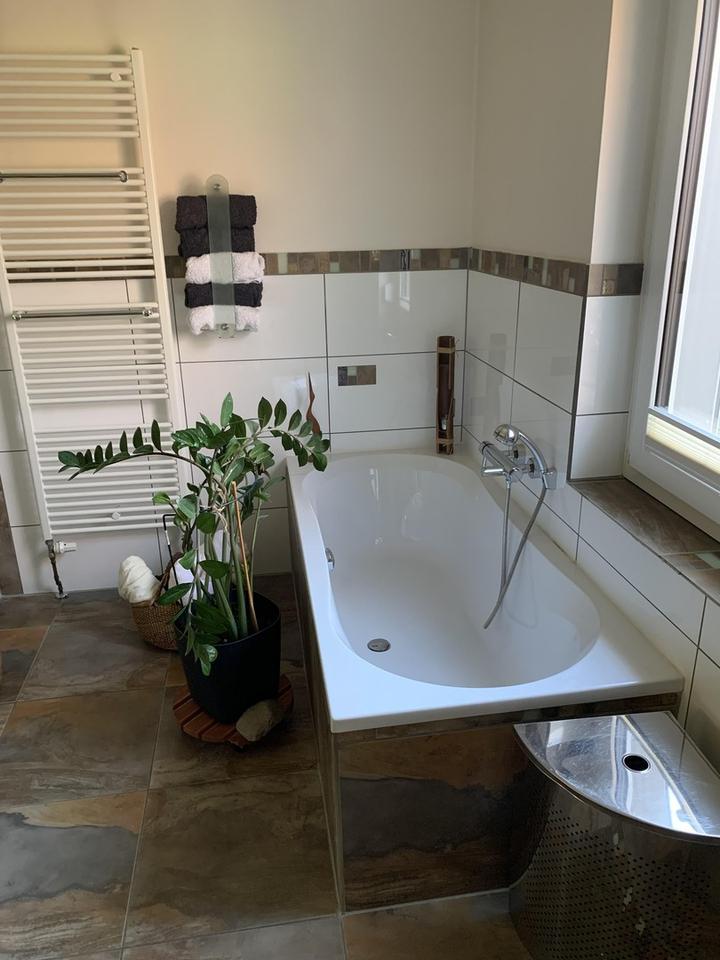 -Badezimmer mit Badewanne und Dusche (beides mit Blick in den Garten)