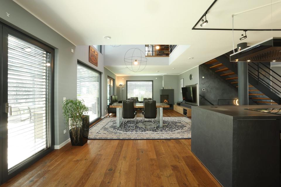 Die moderne Küche lässt keine Wünsche offen: Sie ist mit hochwertigen Markengeräten ausgestattet und ebenfalls inklusive. Ein besonderes Highlight bilden die Designerlampen im Atrium, die dem Haus eine außergewöhnliche Atmosphäre verleihen und im Objekt verbleiben.