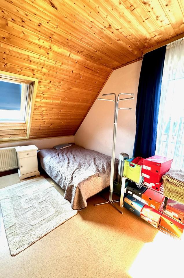 Weitere zwei Räume im Dachbereich werden derzeit als Gästezimmer und Abstellraum genutzt. Im Untergeschoss erwarten Sie eine entspannende Sauna mit Dusche, ein großzügiger Hobbyraum sowie praktische Kellerräume. Der Außenbereich besticht durch eine gepflegte Gartenlandschaft mit einer einladenden Terrasse und einem Gartenhaus.