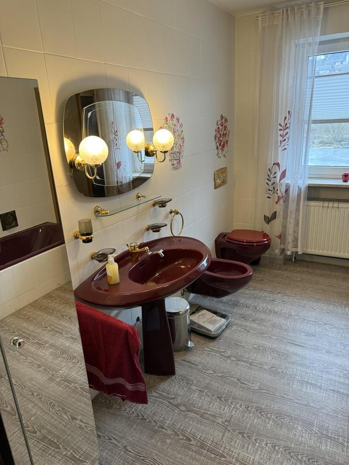 Im 1.OG befinden sich ein Gäste WC und ein Badezimmer mit Dusche und Badewanne. In dem Bad ist auch die erst 1,5 Jahre alte Gasheizung. Dann befinden sich im 1.OG 3 Schlafzimmer, ein sehr großes Ankleidezimmer, sowie ein Büro und ein Kaminofen.