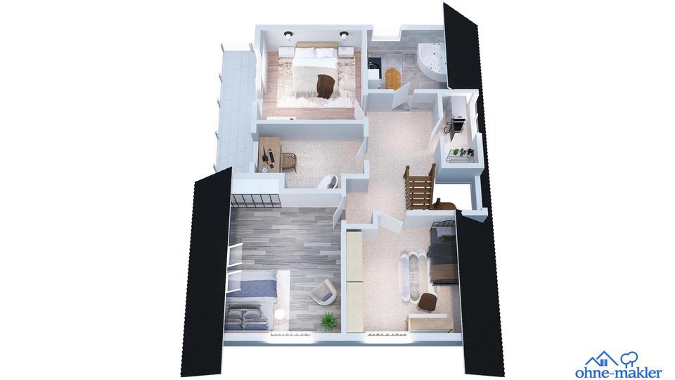 DG: Diele(ca. 11,40m²), großes Bad mit Badewanne(ca. 7,19m²), Elternschlafzimmer mit Zugang zum Balkon(ca. 14,24m²),zwei Kinderschlafzimmer(Kind 1 ca. 14,26m² und Kind 2 ca. 20,62m²), Büro(ca. 8,01m²), Heizungsraum(ca. 3m²), Balkon(ca. 9m²).
