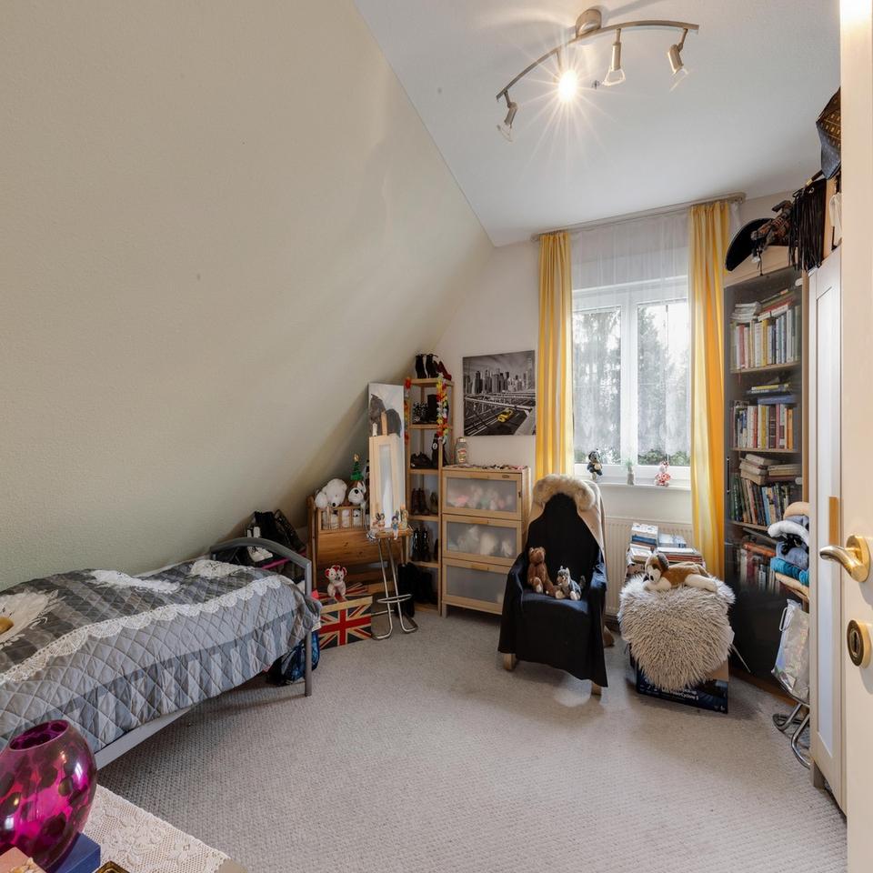 Das Obergeschoss ist ebenso durchdacht gestaltet. Es bietet ein ca. 14,2 m² großes Elternschlafzimmer mit Zugang zum ca. 9 m² großen Balkon, zwei Kinderzimmer mit einer Fläche von ca. 14,3 m² und 20,6 m², die genügend Platz zum Spielen und Lernen bieten, sowie ein weiteres Zimmer mit ca. 8 m², das sich hervorragend als Büro oder Hobbyraum eignet. Das ca. 7,2 m² große Badezimmer ist mit Badewanne, WC und Waschbecken ausgestattet. Ein kleiner Heizungsraum mit ca. 3 m² ergänzt das Obergeschoss und kann gleichzeitig als zusätzlicher Stauraum dienen.