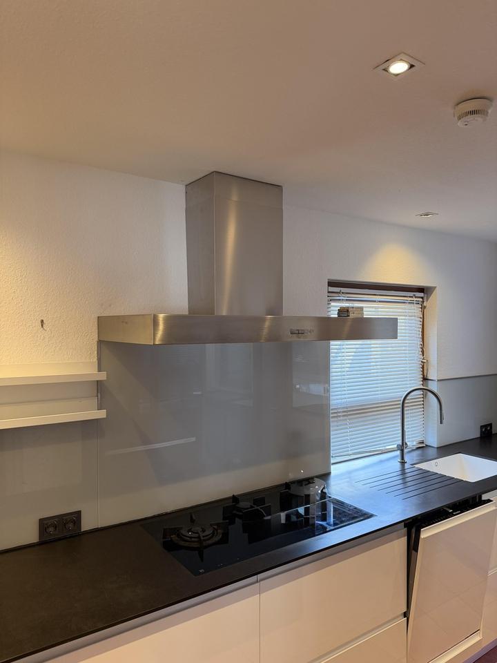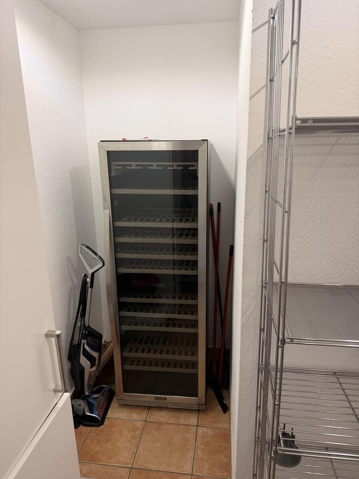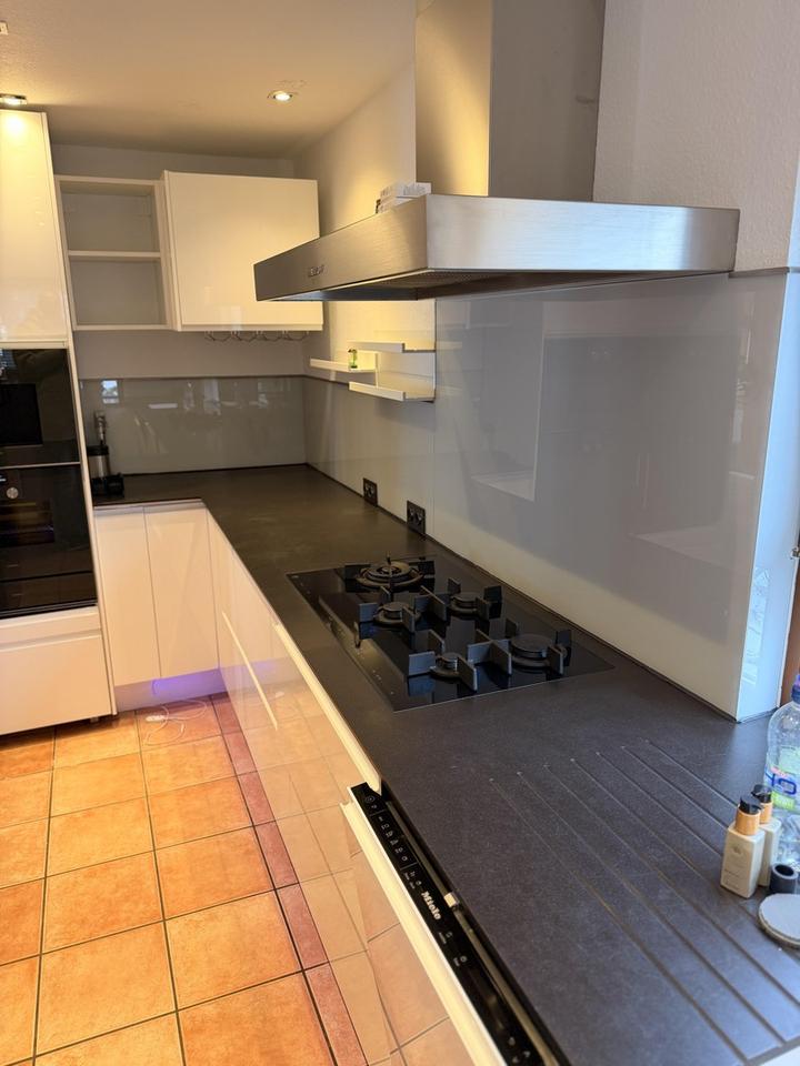Moderne Küche mit Gaggenau E-Geräten Ofen, Dampfgarer, Kaffeevollautomat und Mikrowelle / Ofen sowie ein VZug Gaskochfeld, Geschirrspüler und Siemens IQ700 Kühl-/Gefrierkombi und ein 72Fl. Weinkühlschrank im Vorratsraum angr. der Küche.