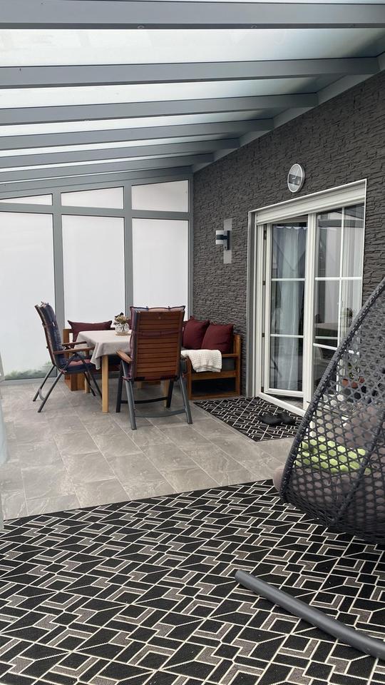 Zusätzlich befindet sich im Erdgeschoss eine abgeschlossene Einliegerwohnung mit separatem Eingang. Mit einer Wohnfläche von 57,78 m2 bietet diese ein Schlafzimmer, Wohnzimmer, Küche sowie Badezimmer mit bodentiefer Dusche und einem Waschmaschinen-Anschluss. Über das Wohnzimmer ist die überdachte Terrasse mit Zugang zum gemeinsamen Garten erreichbar.