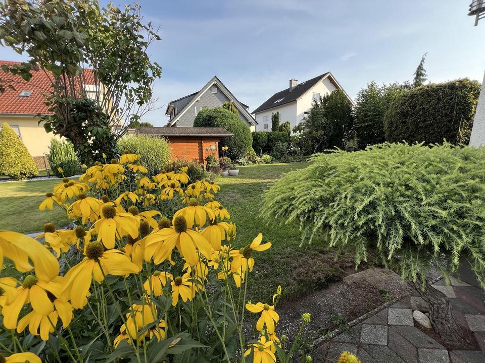 Zum Verkauf steht ein schickes Ein-Familien-Haus mit Doppelgarage und großer Terrasse (50 qm). Abgerundet wird das Anwesen durch einen großen Garten mit geräumiger Hütte.