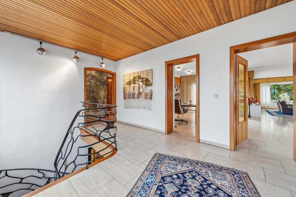 Repräsentatives Einfamilienhaus in ruhiger Villenlage. Außergewöhnlich großzügiger, lichtdurchfluteter Wohn- und Essbereich. Separater Schlaftrack für Familien. Erdgeschoß 162m² mit großem ausgebauten Untergeschoß (Souterrain) und 12x4m großer Indoor-Pool. Baujahr 1971, Modernisierungspotenzial für individuelle Gestaltung auf höchstem Niveau. Maklerfrei ohne Provision.