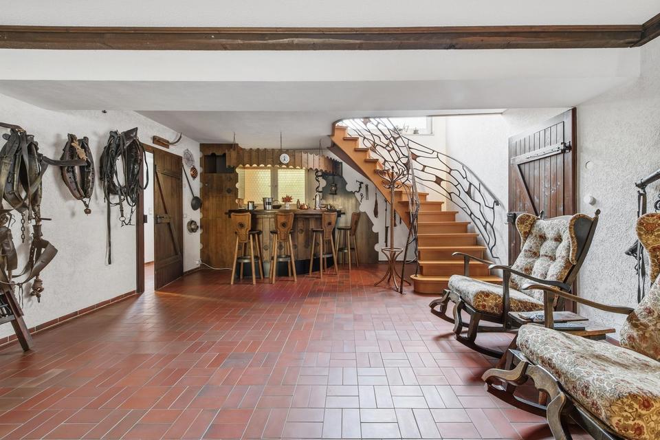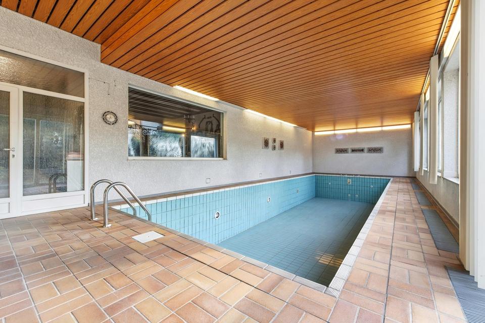 Durch die Hanglage ist das große Schwimmbad ebenerdig und die danebenliegende Terrasse lädt ein zur Erholung nach dem Schwimmen. Das 12x4m große Indoor-Becken erlaubt sportliches Schwimmen. Platz für zusätzliche Sauna und Liegebereich ist vorhanden.