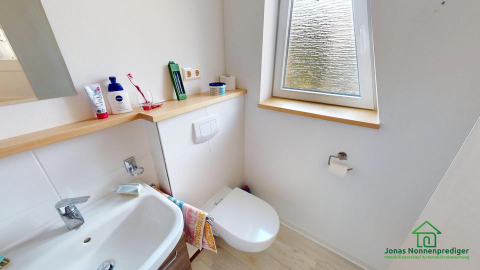 Das Gebäude verfügt über zwei Badezimmer mit Dusche und WC sowie eine Einbauküche. Auf dem Grundstück stehen insgesamt drei Außenstellplätze und zwei Garagen zur Verfügung. Das Objekt befindet sich insgesamt in einem einfachen, dem Alter entsprechenden Zustand und bietet Potenzial für weitere Modernisierungsmaßnahmen.