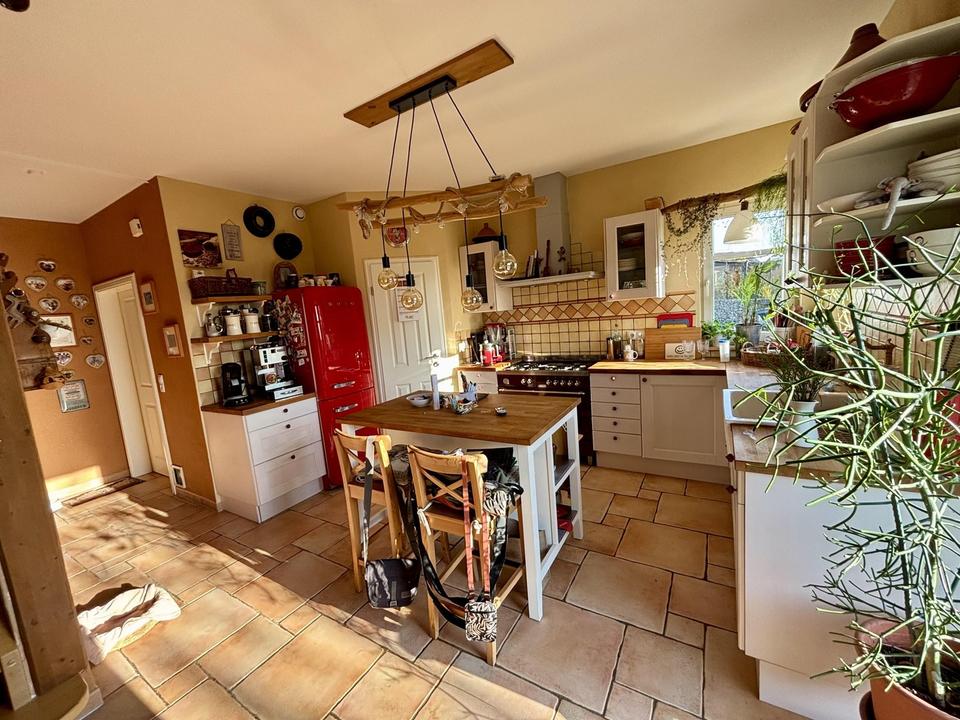 Im lichtdurchfluteten offenen Erdgeschoss befindet sich eine liebevoll ausgestattete Küche im Landhausstil mit separater Speisekammer. Von hier aus geht es über in den großzügig gestalteten Essbereich und weiter in die gemütliche Couchecke. Das gesamte Erdgeschoss besticht mit vielen Details, wie Fußbodenheizung unter mediterranen Fliesen und Lehmputz an den Wänden.