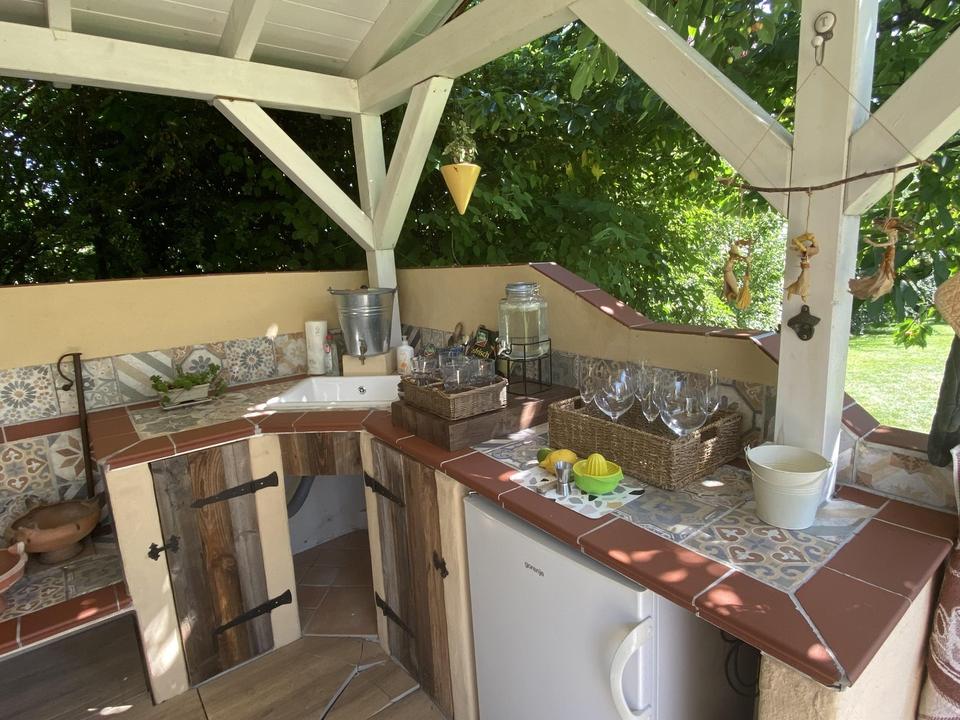 Terrasse und Garten mit massivem Gartenhaus, mit keiner Veranda und großzügiger Aussenküche , vielen Obstbäumen, Bäume und blütenreichen Hecken lassen viel Raum für Erholung im Freien.