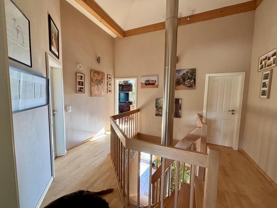 Die offene Treppe in die obere Etage, sowie eine Galerie bieten den zentralen Bestandteil, Kommunikation zwischen den Etagen und Platz für den Wodtke-Kaminofen.