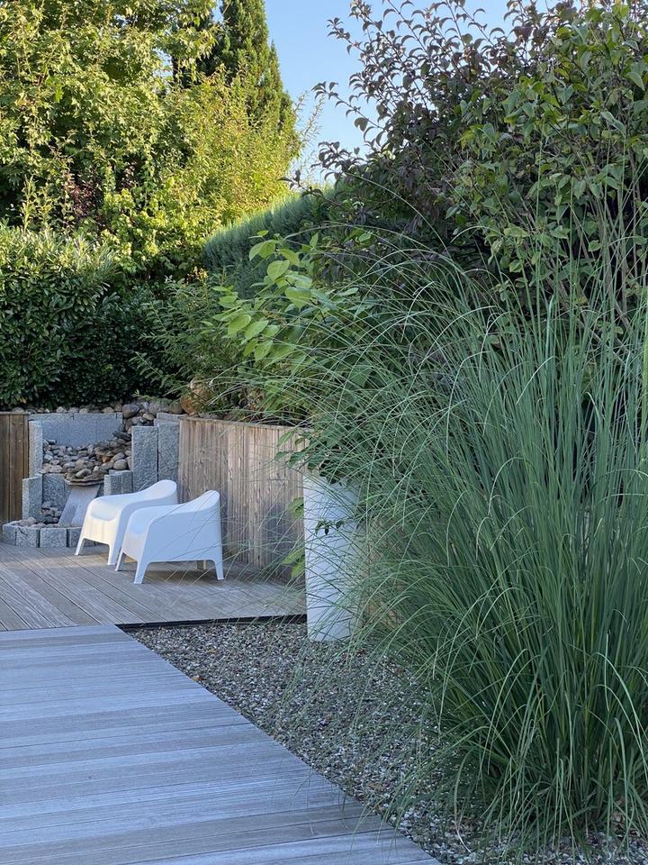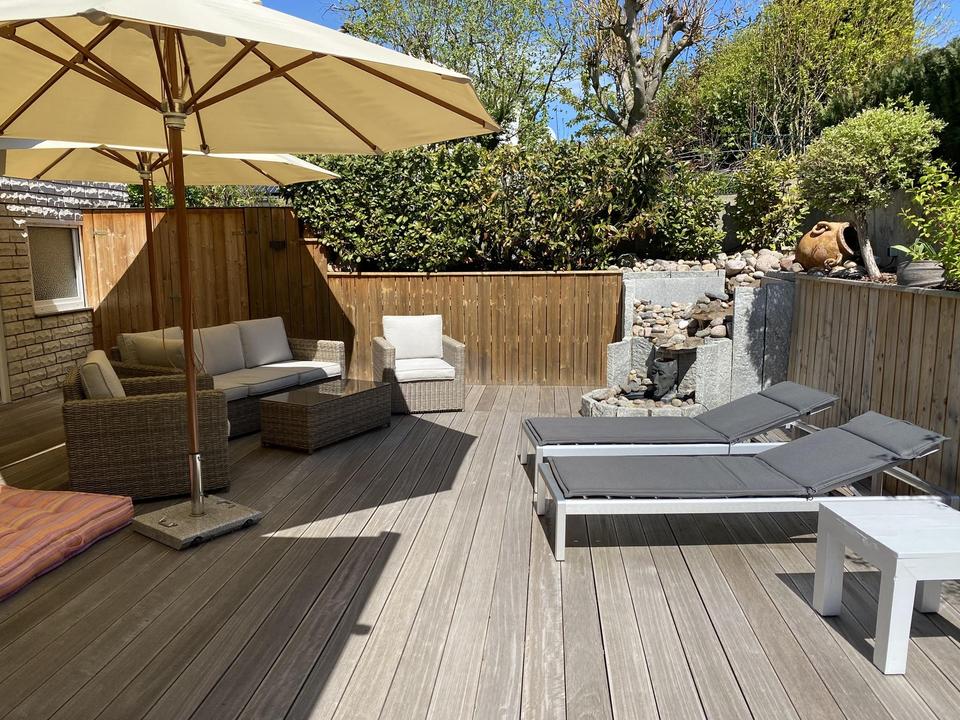 Aussenbereich: Bankiraiholzterrassen, große geflieste Garage, 3fach Carport, Geräteschuppen, elektrisches Hoftor