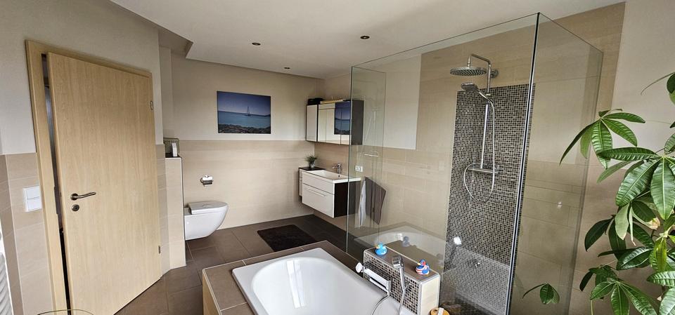 Der moderne Grundriss ist ideal für Familien: In der ersten Etage befindet sich das Kinderbadezimmer, das bequem von den beiden angrenzenden Kinderzimmern links und rechts betreten werden kann. Das Hauptbadezimmer hat eine schöne Badewanne und eine bodentiefe Dusche.