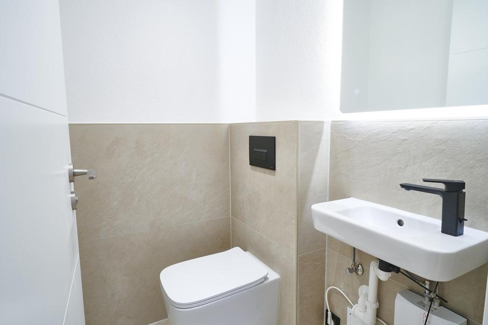 Das Badezimmer präsentiert sich als Wohlfühloase: Große, nahezu bodengleiche geflieste Dusche mit Regendusche und Badkeramik von Villeroy & Boch sowie neue Sanitärinstallationen inklusive eigener Absperrhähne und Wasserzähler.