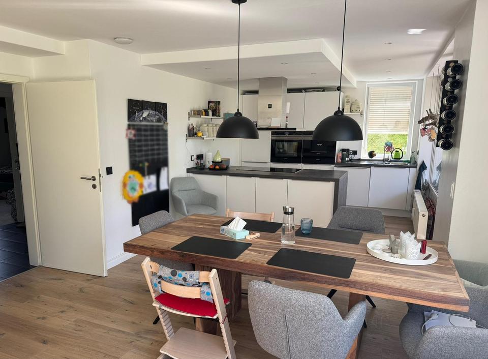 Im Übergang von der Küche in den Wohnbereich findet ein großer Esstisch für bis zu 8 Personen Platz und trennt gleichzeitig die beiden Bereiche optisch voneinander ab.