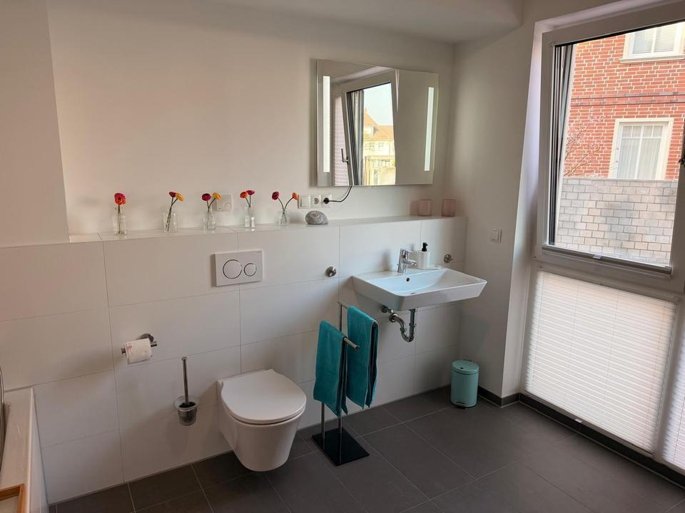 Ein großes, helles Bad im Erdgeschoss überzeugt mit einer bodentiefen Dusche und Badewanne.