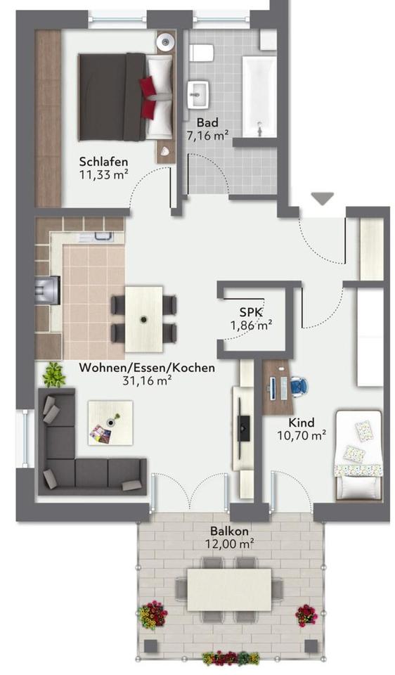 Der großzügige, sonnige Balkon mit Südausrichtung lädt zum Entspannen ein und erweitert den Wohnraum nach draußen.