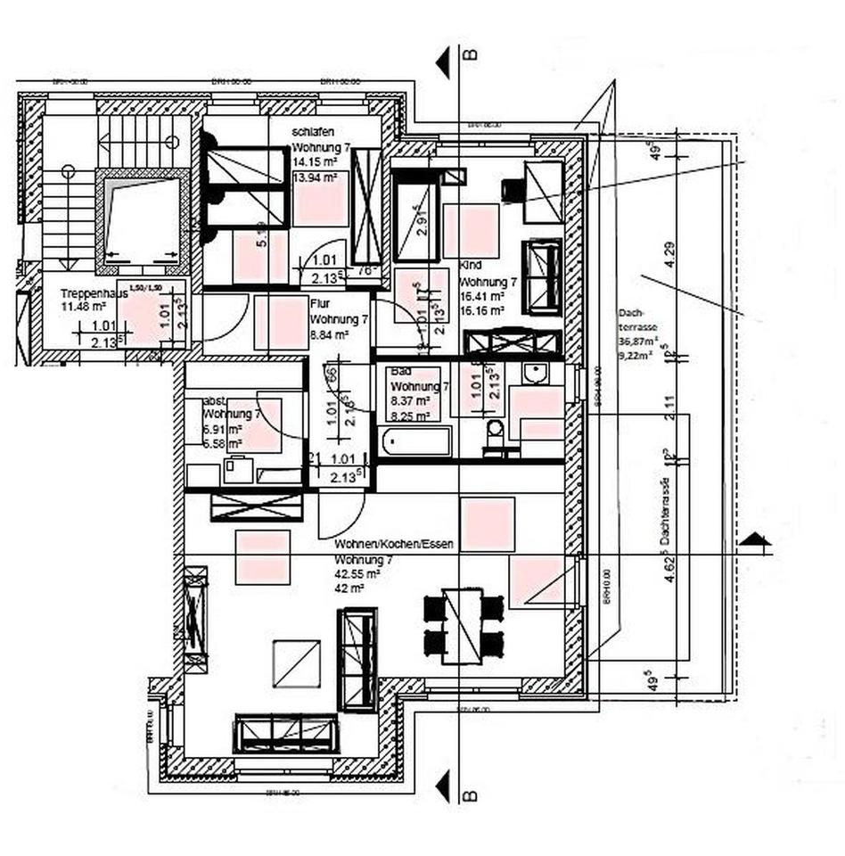 Die Wohnfläche beträgt 105m² (Innenbereich 96m² zzgl. Dachterrasse zu 25% gem. WoFlV).
