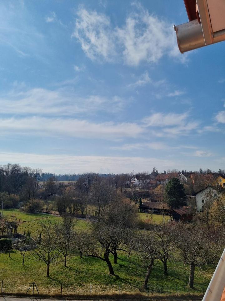 Die Wohnung liegt im Dachgeschoss in einer kleinen Wohnanlage mit Blick auf das grüne Tal.