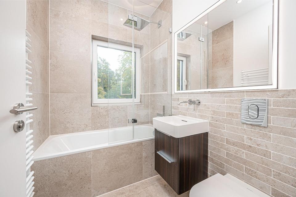 Zwischen Wohnzimmer und Schlafzimmer liegt das moderne Badezimmer mit Badewanne und Fenster.
