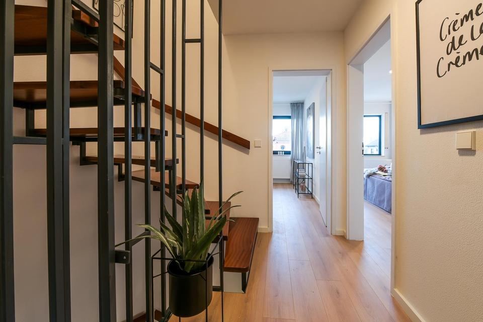 Im Erdgeschoss befindet sich der helle Wohnbereich mit offener Küche. Große Fenster sorgen für eine angenehme Wohnatmosphäre. Von hier gelangen Sie direkt auf die Terrasse – ideal für entspannte Stunden im Freien. Ein Gäste-WC ergänzt diese Ebene.
