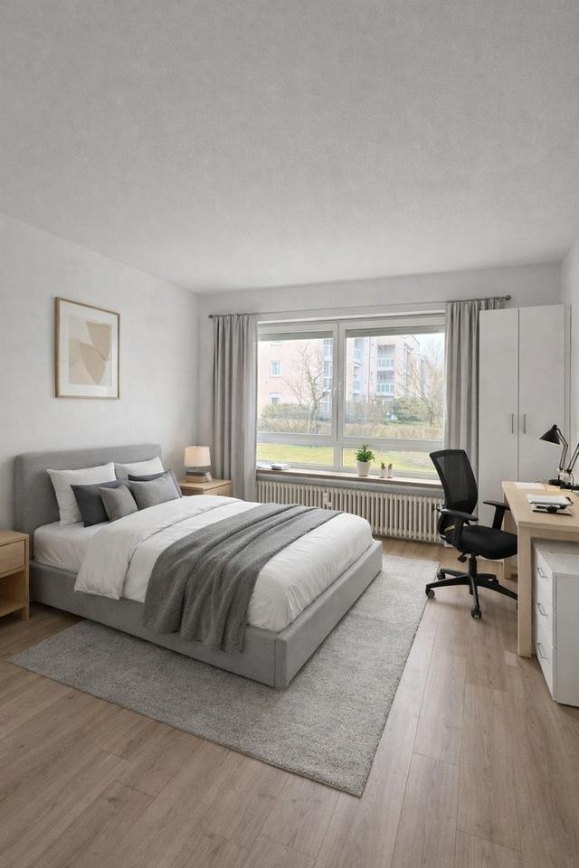 Die Wohnung befindet sich im Erdgeschoss eines gepflegten Mehrfamilienhauses und wurde im Zuge einer umfassenden Renovierung vollständig neu gedacht: Aus einer klassischen 3-Zimmer-Wohnung wurde eine clever aufgeteilte 4-Zimmer-WG, bei der jedes Zimmer als eigenständiger Rückzugsort funktioniert.