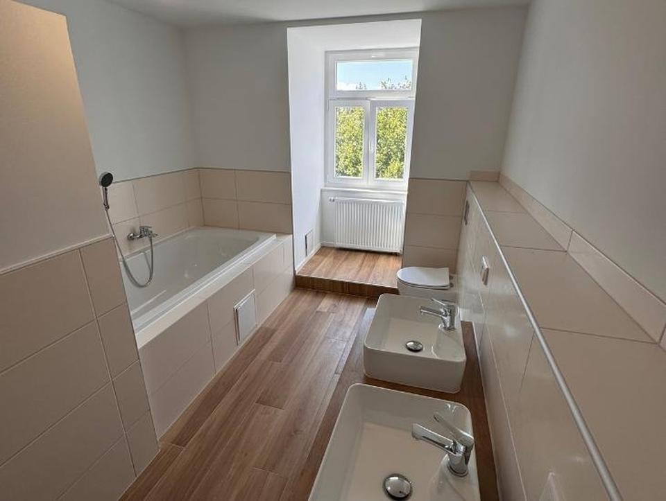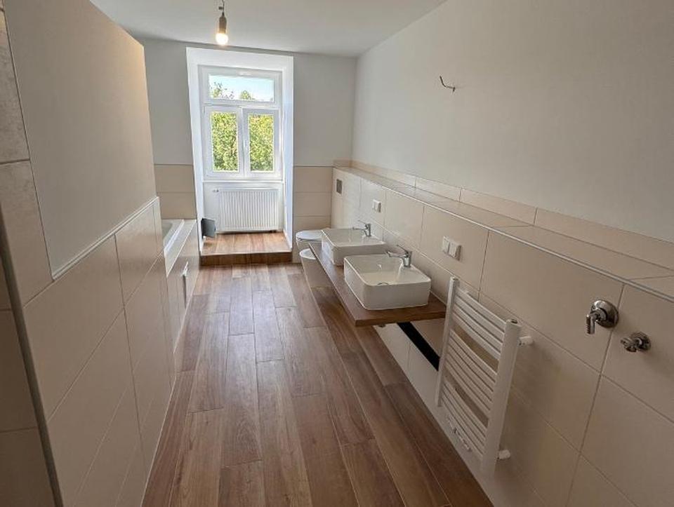 Das Apartment verfügt über ein großes Badezimmer mit abgegrenzter Dusche und Wanne, sowie ein separates WC. Ein Keller bietet zusätzlichen Stauraum.