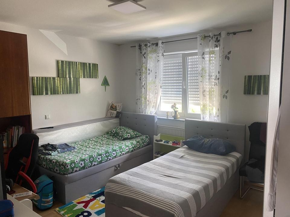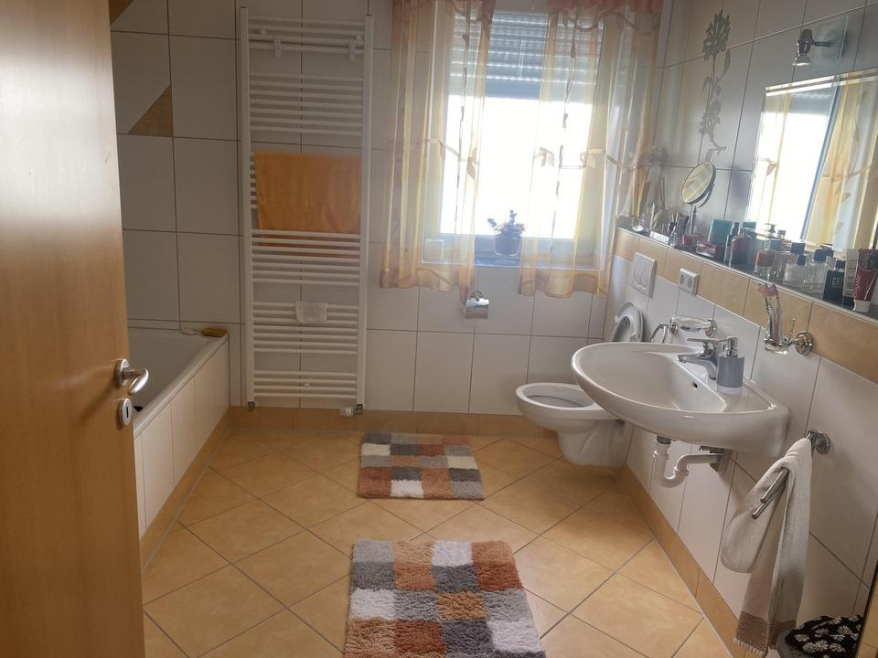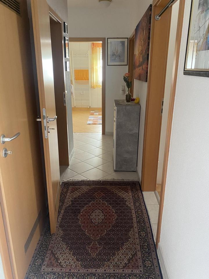 Die Wohnung hat 2 Flure, zum Wohnzimmer hin mit Teilglastüre abzuschließen. Die offene Einbau-Küche mit Sitzbarmöglichkeit, das Esszimmer und Wohnzimmer sind in L-Form geschnitten, mit dem Balkon von Ess- bzw. Wohnzimmer aus begehbar. Ferner gibt es 1 Abstellraum, 1 kleines Bad mit Waschbecken, Toilette und Dusche plus 1 großes Bad mit Fenster (Tageslicht), Badewanne, separater Dusche, Toilette und Waschbecken. 1 Schlafzimmer und 1 Kinderzimmer.