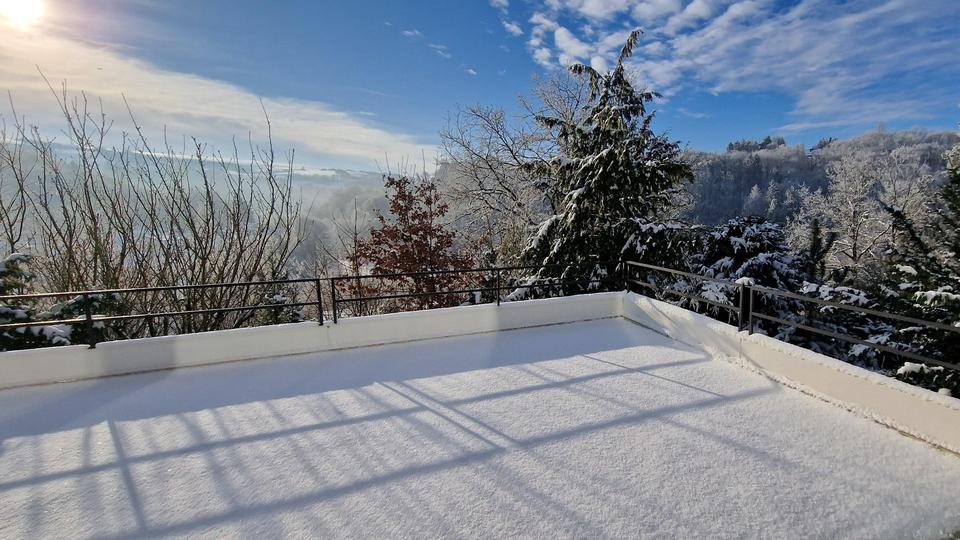 Die exklusive Architekten Villa in Trier befindet sich in einem privilegierten Wohngebiet mit nur neun Häusern und bietet eine ruhige Lage sowie einen beeindruckenden Blick über das Tal. Im Jahr 2022 wurde das Haus umfassend und hochwertig saniert. Dabei wurden sämtliche Flachdächer und die großzügigen Dachterrassen neu gedämmt und mit Alwitra-Folie abgedichtet. Ebenso wurden alle Bäder, Boden-, Decken- und Wandbeläge erneuert oder aufbereitet. Neue Aluminiumfenster mit Dreifachverglasung, eine moderne Pellet-Heizungsanlage sowie zeitgemäße Grundrissänderungen verleihen dem Haus seinen neuwertigen Zustand. Zur Ausstattung gehören Highlights wie eine Sauna, ein Schwimmbad, ein Heimkino, separate Gästebereiche und vieles mehr.Die Vorderseite des Flachdach-Hauses präsentiert sich in einem schlichten Design, während die Rückseite mit großen Fensterflächen und weitläufigen Terrassen einen freien Blick ins Tal bietet. Im Erdgeschoss erwartet Sie ein großzügiger Wohnbereich von ca. 56 m², der fließend in den stilvollen Kaminbereich (ca. 15 m²) und das Esszimmer (ca. 28 m²) übergeht. Große, nach Süden ausgerichtete Fensterfronten durchfluten die Räume mit Tageslicht. Eine vorgelagerte Terrasse mit etwa 90 m² lädt dazu ein, die Sommerabende entweder in geselliger Runde oder in Ruhe zu genießen. Der durchgehend helle Marmorboden, der im Rahmen der Sanierung aufwendig aufgearbeitet wurde, unterstreicht die hochwertige Ausstattung.Zusätzlich befindet sich auf dieser Ebene eine weitere, teils überdachte Terrasse (ca. 24 m²), die vom Esszimmer zugänglich ist und auch bei schlechtem Wetter nutzbar bleibt. Hochwertige Außenjalousien an allen Fenstern ermöglichen die individuelle Regulierung von Licht und Privatsphäre. Eine gemütliche Wohnküche mit ca. 20 m², zugänglich sowohl von der Diele als auch vom Esszimmer, ist mit einer Einbauküche und hochwertigen Elektrogeräten ausgestattet, die im Kaufpreis enthalten sind. Außerdem umfasst das Erdgeschoss ein Büro oder Gästezimmer (ca. 16 m²) sowie ein modernes Gästebad mit bodengleicher Regendusche.Über eine helle Marmortreppe gelangt man in das Obergeschoss mit fünf Schlafzimmern und zwei bis drei Bädern. Die vier Kinderzimmer (je ca. 15 m²) sind lichtdurchflutet und verfügen jeweils über Terrassenzugang sowie einen herrlichen Ausblick ins Tal. Das Elternschlafzimmer mit Ankleide (ca. 26 m²) bietet ein luxuriöses Bad en Suite mit freistehender Badewanne und Multifunktionsdusche. Hochwertiger Teppichboden prägt diese Etage, während die Bäder mit Fußbodenheizung ausgestattet wurden.Im Untergeschoss des Hauses befindet sich eine Wellness-Oase mit Umkleidebereich, finnischer und Infrarot-Sauna, bodengleicher Dusche, WC sowie einem großzügigen Swim-Spa mit Gegenstromanlage und Whirl-Funktion. Große Glasfronten umrahmen das Schwimmbad und führen auf eine private Terrasse mit Gartenanschluss. Die stilvoll eingerichtete Bar im James-Bond-Design verfügt über direkten Zugang zum Schwimmbad und zur Terrasse. Das hochwertige Mobiliar sowie die Soundanlage der Bar sind im Kaufpreis inbegriffen.Ein weiteres Highlight ist das schallisolierte Heimkino mit moderner Technik wie 4K-Beamer, High-End-Surround-Sound und elektrisch verstellbaren Ledersesseln. Es ist ebenfalls im Kaufpreis enthalten. Über eine Wendeltreppe besteht ein direkter Zugang von der Bar zur Kaminecke im Erdgeschoss.