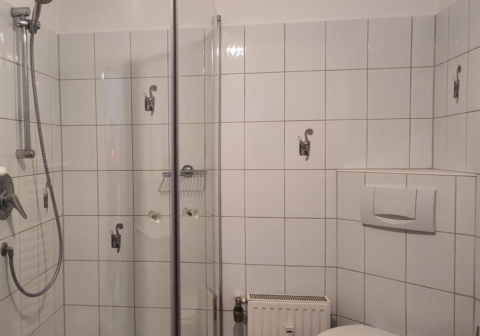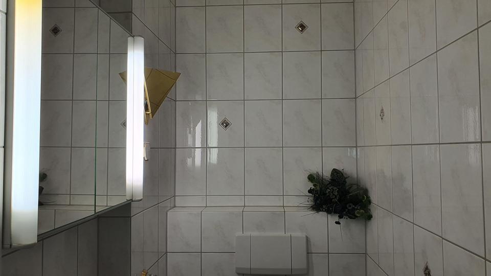 Das weiß geflieste Badezimmer mit hell-grauem Bodenbelag ist mit einer Rund-Dusche und zusätzlich zur Heizung mit einem beheizten Handtuchhalter ausgestattet. Badezimmer und Küche können mit einem Waschmaschinenanschluss versehen werden. Alternativ kann die Waschmaschine in der Waschküche (Gemeinschaftsnutzung) mit Trocknungsmöglichkeit im Keller verwendet werden. Die beiden Terrassen können mit Markisen über die komplette Fläche beschattet werden, wobei die Markise vor dem Wohnzimmer bequem elektrisch bedient wird.