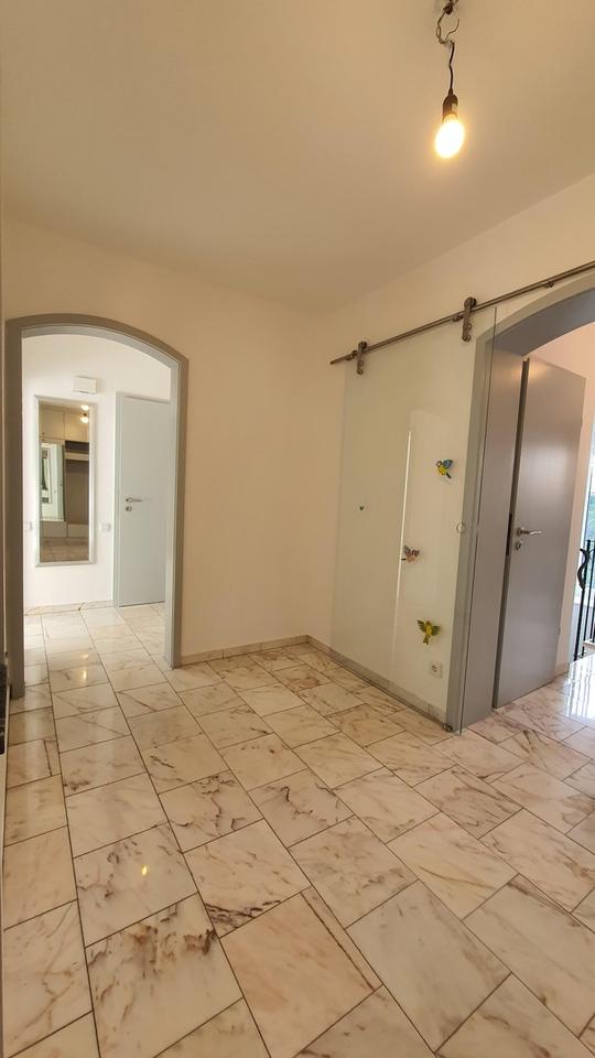 Wohn-und Esszimmer sind mit Echtholz-Parkett, alle weiteren Böden der Wohnung incl. Küche und Gäste-WC sind mit hochwertigen weißem Marmorboden belegt. In der Diele befinden sich neben der offenen Garderobe mit Schuhschrank mehrere Einbau/ Abstellschränke, die mit Regalen und Kleiderstangen versehen sind. Das Schlafzimmer ist mit einem deckenhohen, dreiteiligen Schiebetüren-Kleiderschrank ausgestattet.