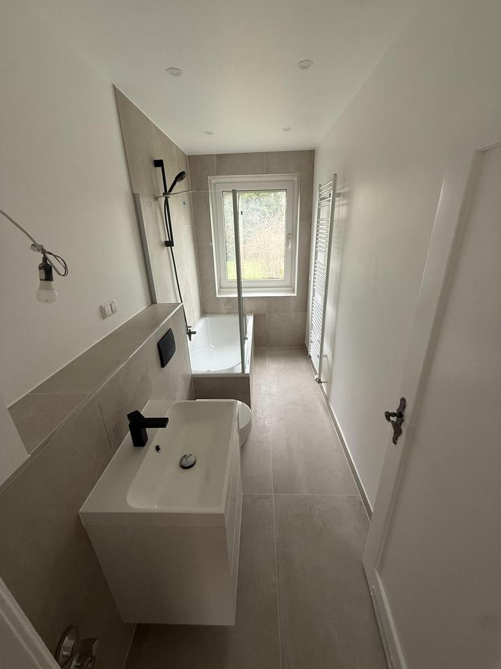 Das Tageslichtbad wurde vollständig erneuert und hochwertig installiert – mit modernen Sanitärobjekten, zeitlosen Materialien und einer klaren, eleganten Gestaltung.